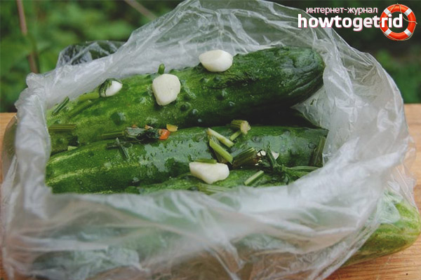 - After the allotted time, shake the contents of the package again. Fill the polyethylene with air and tie it tightly. Send the bag in this condition to the refrigerator. After just 1 hour, the lightly salted cucumbers will be ready.