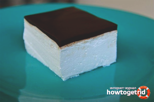 - Pour the finished white mass over the chocolate layer, send it to freeze for 3 hours. At the end of the time, cut the cake in portions, serve with tea or coffee.