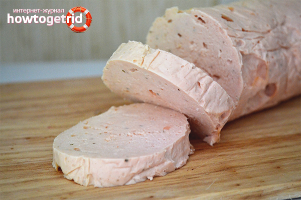 For a kilogram of chicken breasts, you will need three egg whites, a little black pepper, 300 ml of fat cream, seasoning to your taste. Chicken fillet should be chopped, add cream, salt and spices. Then form one or several sausages from the mass and fix the edges with a rope. If you are afraid that the sausage will lose shape during cooking, you can wrap it with a rope and in length. Dip the sausage in cold water and put on medium heat. So that sausages do not float when cooking, they must be lowered to the bottom with a saucer. Fire after boiling can be reduced. Cook chicken sausage for about an hour.