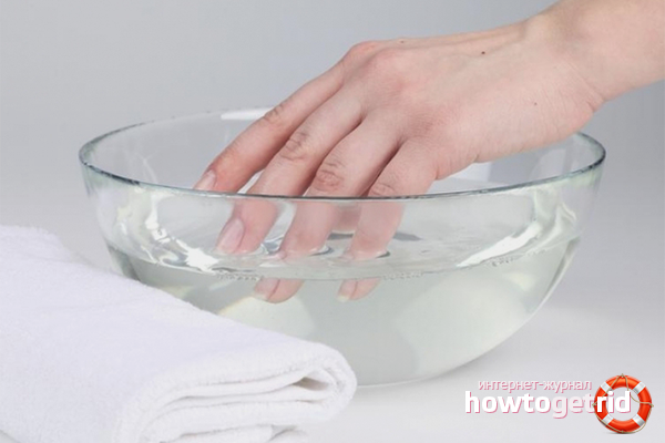 - When the composition reaches a comfortable temperature, dip your fingertips into it. Hold the hand bath until the plates are soft.