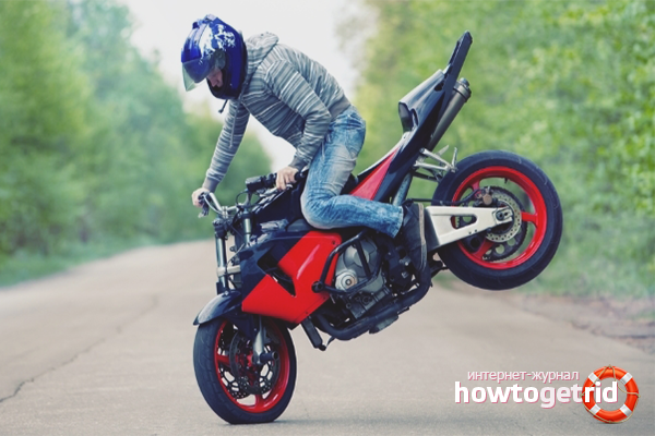 Move the basin away from the tank to load the rear wheel, restoring balance. Keep your foot on the foot brake and two fingers on the hand. Apply the rear brake once more, then slightly on the front brake (about 15-20%), squeeze the clutch to the end, evaluate the degree of pressing on both levers. If you lock the wheel, release the desired brake, wait for the restoration of work.