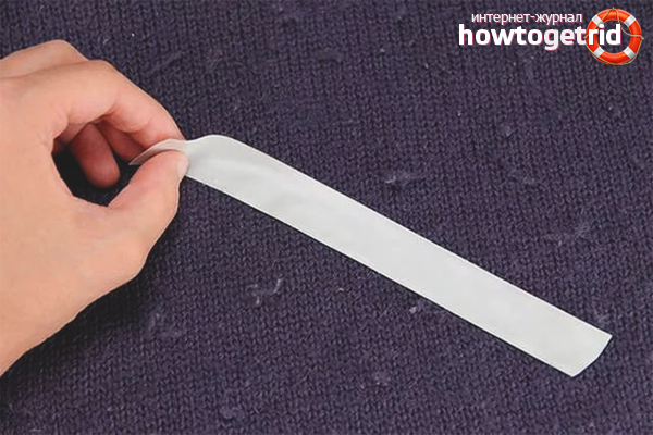 - After preparation, stick a strip of adhesive tape to the area with the spools, squeeze well and pull sharply. Thus, you will tear off all neoplasms, including remove dust and dirt. If necessary, the manipulations are repeated several times in one zone.