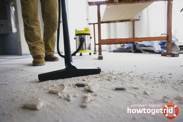 - If you pick up leftover dust with a broom, do not wave it strongly. Be sure to protect the airways as a thick cloud forms in the room. Vacuuming affects not only the flooring, but also all hard surfaces. These include walls, windows, window sills, doors, ceilings. Of course, you cannot handle one approach. The first stage is draft, the second is final.