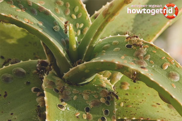 - Aloe has pests that cause a lot of trouble to the plant. Mealybug is a fairly large insect that can be removed by hand or with tweezers.If you notice such an uninvited guest, treat the leaves with garlic tincture for alcohol or special insecticides. Against a spider mite, spraying the plant with cold water will help.
