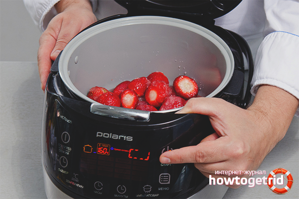 - To begin, carry out preliminary training, eliminating all unnecessary. Go through the berries, remove the spoiled and dented ones. Pour cold water into the basin, send the berries into it. Fold the strawberries on a sieve, leave to drain moisture. Shake the appliance periodically so that the strawberries dry better.