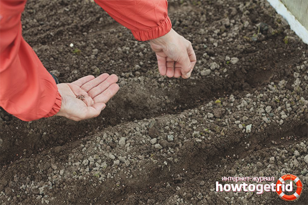 Dig the soil, harrow a rake. Then they plot the beds at a distance of 10 cm from each other. Depth 5-5.5 cm.The bottom of the grooves can be dusted with ash or clean sand. Just the seeds of the radish are dark, and so they will be clearly visible.