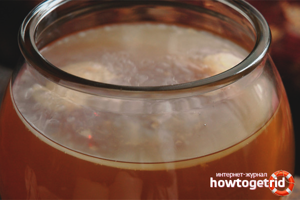 During growth, the fungus requires more liquid medium, about 3 liters. And when you pour a drink, each time compensate for the shortage by adding liquid. This may be an unfinished infusion, which is cooled, sweetened per liter of boiling water 2 tbsp. l sugar and mix until complete dissolution of granulated sugar. Insoluble sugar on kombucha is one of the causes of jellyfish disease.