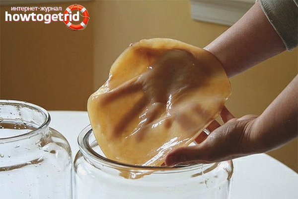 At the final stage, the liquid becomes lighter, and a multilayer jellyfish grows on its surface. It is transferred to clean dishes with sweet tea and then according to the usual scheme.
