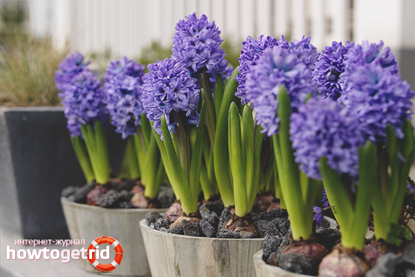 In order to grow hyacinth at home, you need to plant it correctly. How many pieces to plant in one pot? It depends on what size it is. Maybe your pots are enough for 7 or 9 bulbs. But the most effective are single landings, or three hyacinths of different colors in one tank. To do this, there must be openings on the bottom of the vessel to drain excess fluid. They are sprinkled with a thick layer of drainage. For example, expanded clay or fine gravel. Then add a little clean sand on top.
