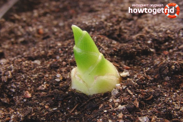 The root is planted shallowly, only a couple of centimeters from the surface of the soil. Until a sprout appears, future ginger should be watered sparingly, being careful that the soil is constantly slightly moistened, but not wet.