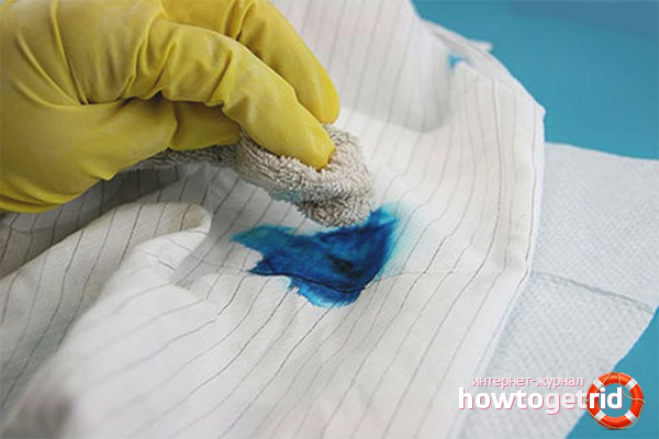 - Pour alcohol gently onto the stain. Wait for the fabric to soak. Then use a cotton swab to drive the stain into a towel. Usually, the paint, which has not had time to absorb into the fibers, dissolves with alcohol and, as it were, “flows out” onto the towel.