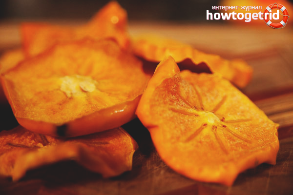 - Remove the peel from persimmons, chop into slices and put in the oven for 40 minutes, bake at a temperature of 50 degrees. Pay attention to the condition of the pieces, they should remain light. The presence of white plaque indicates a high sugar content in the fruit. This operation allows you to save persimmons for up to 90 days.