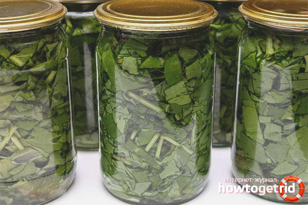 - We have already prepared, chopped sorrel into cans with the addition of two pinches of salt per half-liter jar (respectively, if the volume of the container is larger, then the salt is added in proportion).