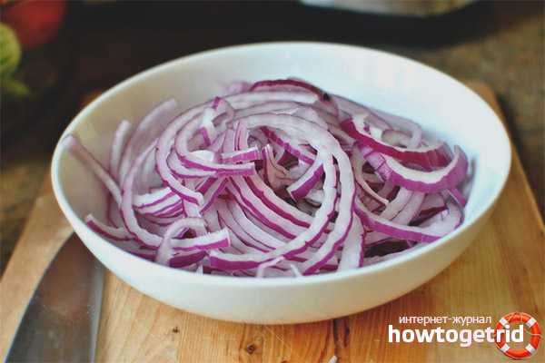 - Chop onions finely with herbs. Separately prepare a 50 ml marinade. vinegar and 20 gr. granulated sugar. Warm up 250 ml. water to 45 degrees. Pour her onion, pour the marinade. Sprinkle a pinch of salt. Leave the blank as it is for 2 hours. Stir occasionally. After that, discard the appetizer in a colander, serve it to the table.