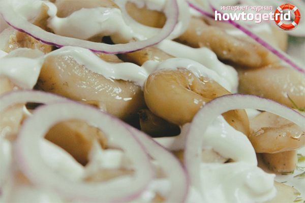 - When the specified period expires, remove the composition and rinse the mushrooms under the tap. In another bowl, mix 60 g. salts with filtered water, wait until the crystals dissolve. Pour mushrooms with brine and establish oppression, wait 12 hours.