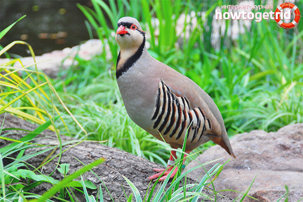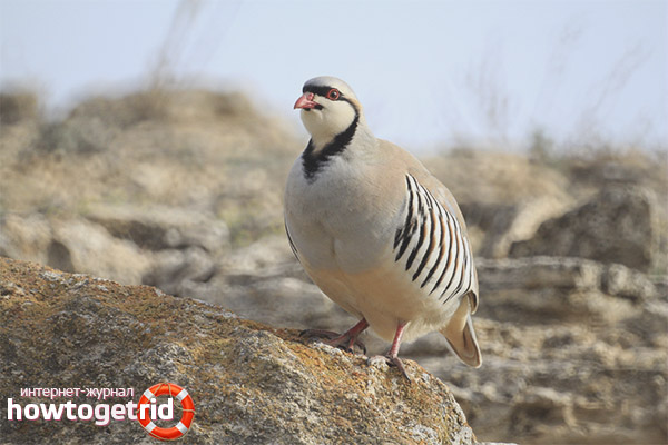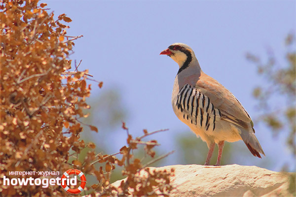 Rocky partridges are active before dark. Waking up with the first rays of the sun, for some time they were talking violently about something, screaming fervently, welcoming the awakening nature. Then comes the time of watering and hunting, when feathered fun fly away to the pond. So, they spend all day getting their own feed. Most often they can be seen walking around the stones than sitting on tree branches.