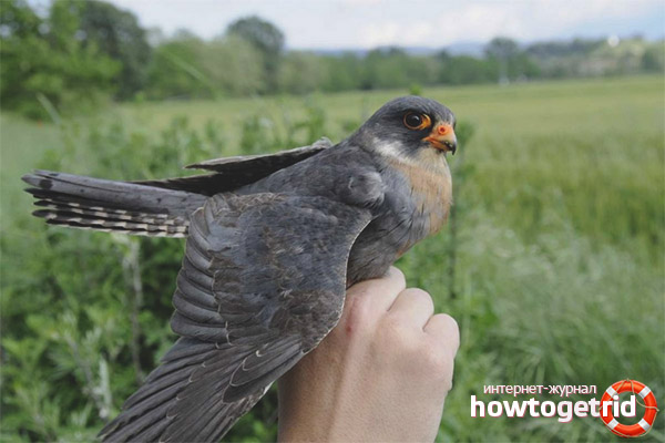 The males are predators. They are small in size and can catch the appropriate food. Therefore, these birds usually feed on large enough insects (bugs, dragonflies). In Africa, they like to profit from locusts. If they do not find bugs, they can catch small rodents. In addition, they even catch small snakes and lizards. Less commonly eat sparrows and larger birds - pigeons. During the hunt, predators fly above the ground and look for prey. Having noticed the victim, they begin to flap their wings more often and can freeze for a moment in the air, then they rush sharply down and catch it from the ground. If the prey has already moved, they can run after it on its paws. These birds are fast, very mobile. On the fly, they catch insects, like other falcons, with their paws, not their beak.