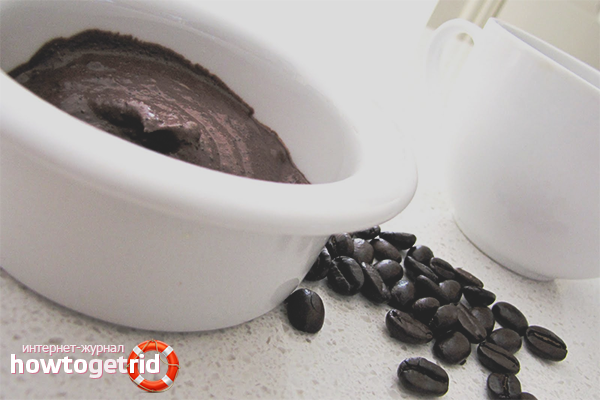 In order for the procedure to proceed most simply and comfortably, it is recommended to use coffee grounds for masks. The mask must be kept for about half an hour, then rinse with non-hot water. Otherwise, you can rub the cooled ready-made drink into the skin.