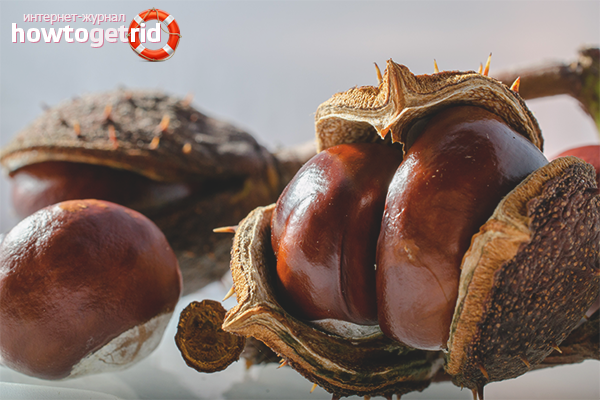 - Phlebeurysm. Most often, chestnuts are used to prepare a medicine against this disease. A decoction of fruits and inflorescences perfectly dilutes the blood, protects against blood clots, increases the elasticity of blood vessels.Thanks to this, the veins begin to work better, the blood in the legs does not stagnate. With regular use of horse chestnut medication, you can get rid of spider veins and significantly improve the condition of the veins. In the fight against varicose veins, fresh inflorescence juice is used, a decoction of chopped chestnut fruits - both externally in the form of lotions and inside to thin the blood.