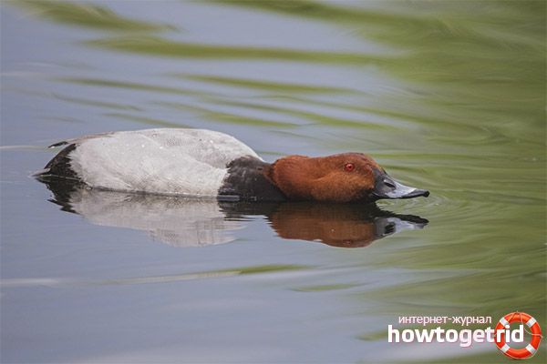 During diving, the red-headed dive, as a rule, disappears in the water for a rather long time (up to 20 seconds). The main feature is that the bird dives under water, pushing strongly off the water surface with its feet. For feeding, representatives choose reservoirs with clean water. The depth of diving of an adult is up to 3.5 m. Birds love to splash around in shallow water.
