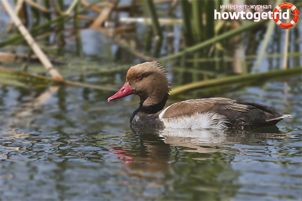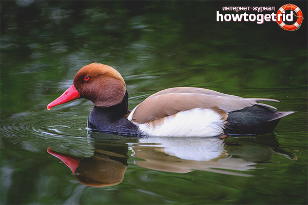 The red-nosed duck is a fairly large bird from the order of Anseriformes, its weight reaches 1.5 kilograms. The male dive has extraordinary attractiveness in the spring, when it is time to choose a bride. On the eve of the mating season, the plumage of a feathered beauty is covered with a bright set of colors, expressed in contrasting combinations. The head of the male has a color, consisting of a very bright red color, with darker stripes in the eye area. Its beak and paws acquire a bright red hue, the abdomen and chest of the bird get a saturated black color with a characteristic tint, and snow-white oval spots loom on the wings of the dive.