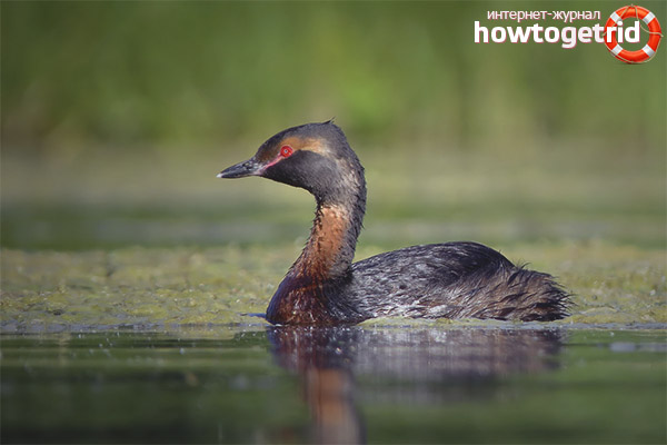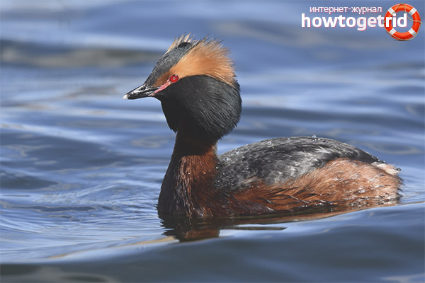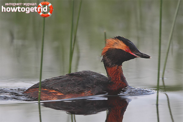 These small grebes are about the size of teals. Their growth is from 31 to 38 cm, and the size of the wingspan is from 59 to 65 cm. They resemble black-necked grebes with their dimensions and appearance, during mating periods they differ from them by the fiery red neck and golden feather ears, which raised at this time.