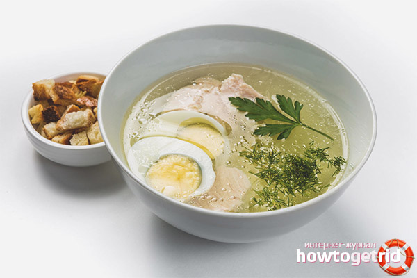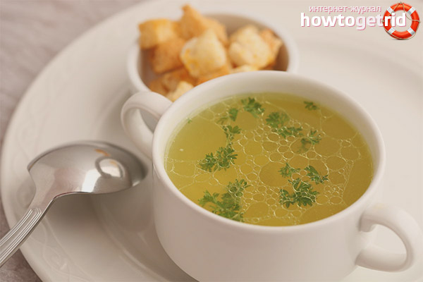 - Lean meat broth with vegetables is optimal in pH, it does not irritate the walls of the stomach and is easily digested. The broth should be slightly salted, it should not be added to the fry, as in a soup - these are excess fats. But to cook a chicken with vegetables and light spices is a good idea, this will add vitamins to the dish. It is best to take carrots, celery, leeks, broccoli, parsley, dill, bay leaf, coriander, mustard. Drinking broth will work best for starting digestion, but you can also make mashed soups on its basis.