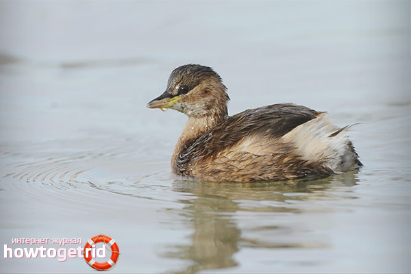 Lesser Grebe chooses moderately overgrown standing reservoirs and ponds for the settlement, where it prefers to remain inconspicuous and quiet. She often hides in thickets of reeds and other aquatic vegetation, organizing floating nests in the same place, using plant “waste” of water and muddy bottom.