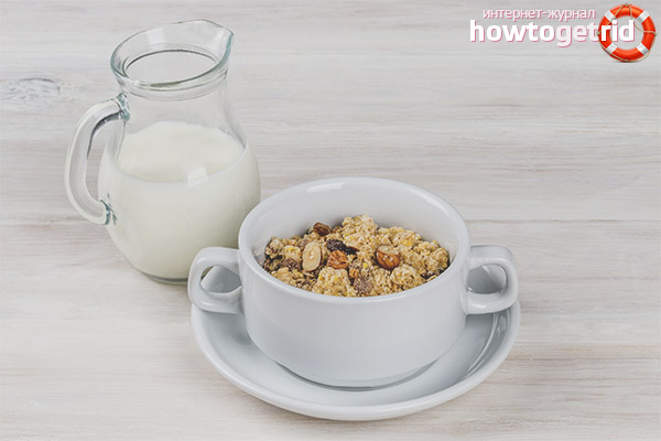 The diet also includes a strict water regime of at least 2 liters per day, meals at regular intervals, given that dinner is not later than 4 hours before bedtime. Intermediate snacks are excluded, if you are very hungry, you can eat an apple or an orange.Muesli is recommended to be filled with 1% kefir, 1.5% milk, natural yogurt, mineral water without gas, freshly squeezed juices, berries.