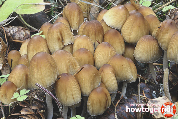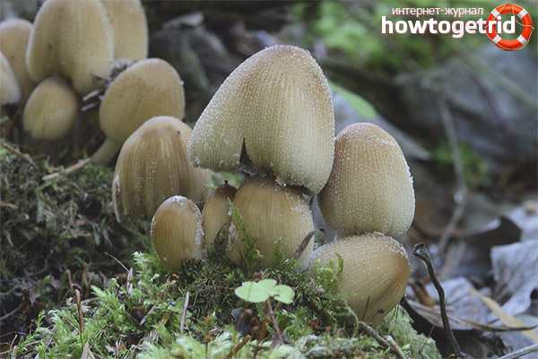 - Coprinus copepods. This mushroom should not be eaten. The hat has a fusiform shape, but the next day takes on the shape of a bell. And after a while it becomes almost flat. Even at the stage of bell shape, the hat begins to decompose. White flakes of small size are visible on the surface. The pulp of the mushroom is fragile, the leg is usually curved and has scales. The fruiting period begins in the summer and lasts until the fall. The mushroom grows on decaying trees or in a pasture where the soil is fertilized with manure. The body of the mushroom develops rapidly and fades.