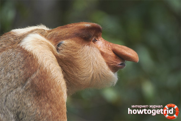 The main feature of the primates of the male is a large pear-shaped nose, lowered down, its size can reach 10 cm in length. Sometimes this organ causes a lot of inconvenience during eating, and the monkey is forced to support it. When studying the olfactory abilities of the nose and its purpose, the opinions of experts were divided.