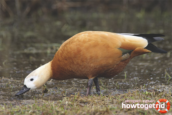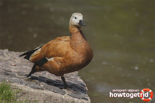 The peculiarity of this bird that distinguishes it from others is the plumage of bright shades, the body is orange with brown. At the beginning of the year, the bird is painted in darker shades, and by autumn the color fades, becoming paler and brighter. The neck and head are white with a copper tint. At the tail and the tail, the tide is green. The mandible with the mandible at the edges have rare, rather thin large teeth. White wings are decorated with black fly feathers, the same colors at the beak and long rather strong legs. When the bird is in flight, large whitish spots are visible on the lower part of the wings.