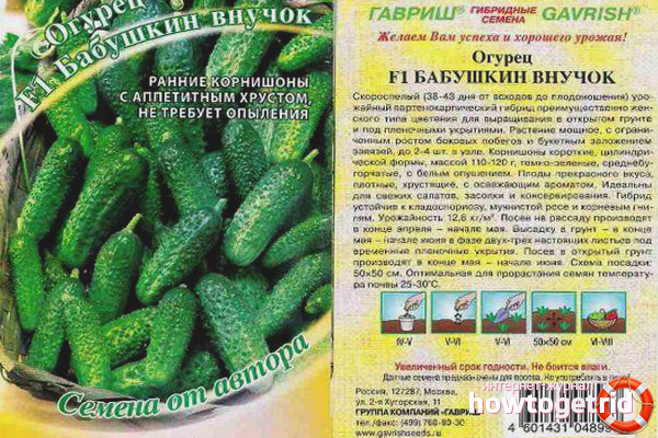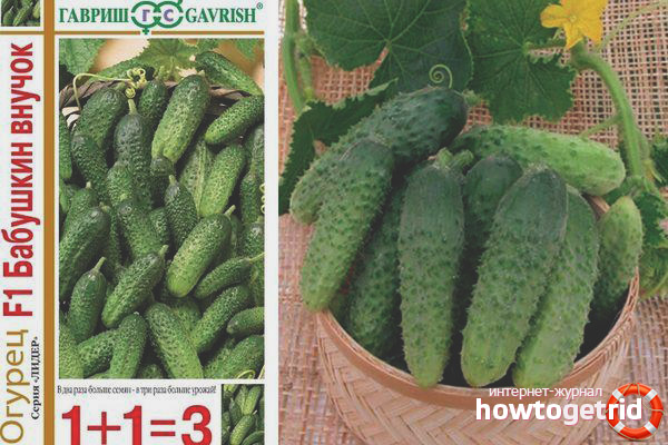 Grandmother’s cucumbers of the granddaughter class belong to early ripening, parthenocarpic hybrids. The plant grows well and gives a large crop when grown in open beds and in a closed greenhouse. The variety is distinguished by the presence of a female type of inflorescences, the average size of the bushes and relatively small leaves, which are painted in a saturated, green color.