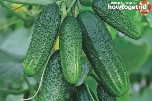 Fruits are elongated cylindrical in shape, from 14 to 18 centimeters, weighing 90 - 110 grams. The peel is a pleasant saturated color, glossy, tuberous, without pubescence. The vegetable has a pronounced pleasant smell, the fruits are juicy, crunchy, not bitter. Cucumbers are suitable for pickling and preservation, as well as for fresh consumption.