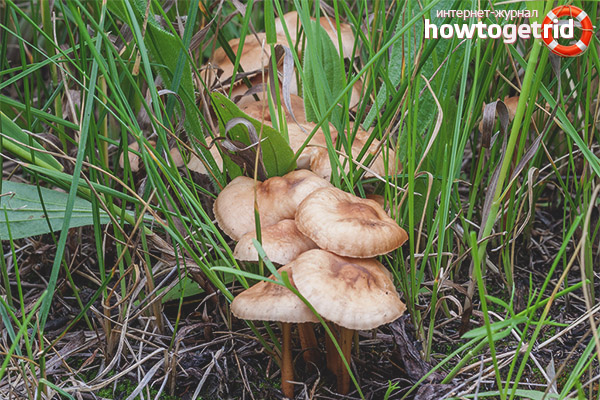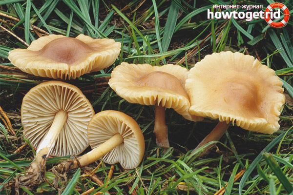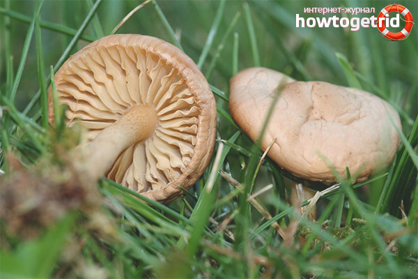 The whitish talker has an even greater resemblance to meadow honey agarics. This is a very dangerous, poisonous mushroom. It has a white hat raised at the edges. The pedicle is very short, up to 4 cm. It grows in the places where meadows grow, sometimes even in the immediate vicinity.