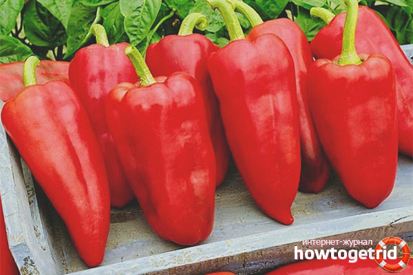The plant is powerful, well leafy, stocky. Bushes require the formation, removal of stepsons. The fruit is elongated, pyramidal Reform, with full biological maturation, has a bright red color and a glossy skin. A variety of universal purpose. It is good for making lecho, ketchups, ideal for stuffing and canned fruit.