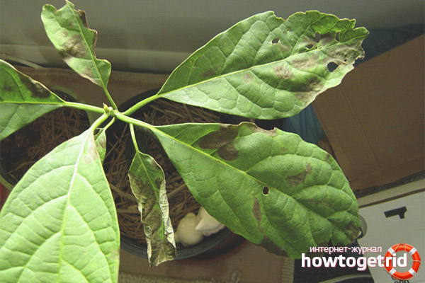 A spider mite or a scab can hit a plant. They breed very quickly, settling on the trunk and on the leaves.If you miss the hit of parasites, the plant can be lost in a short time. Note that the avocado began to hurt, it is possible by the color of the leaves: they become yellow and not so hard, and then begin to fall off.