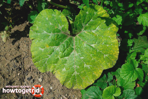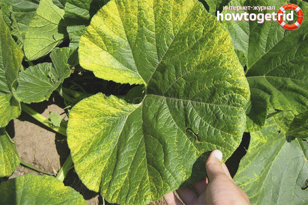 Damage to the plant by pathogenic bacteria or pathogenic fungal spores is the most common cause of yellowing of pumpkin leaves. The most common diseases and methods of getting rid: