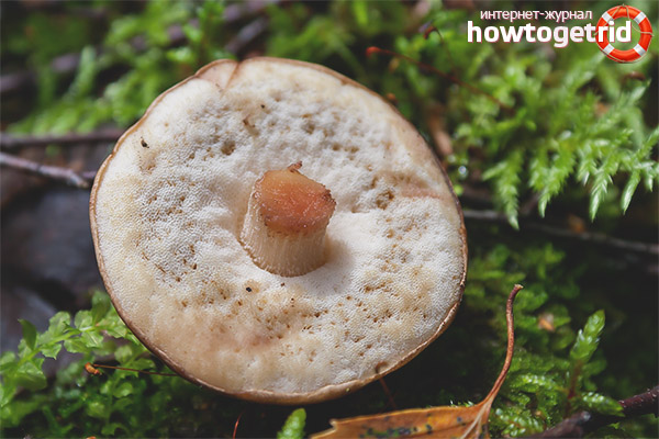 - The reverse side of the hat is light, but not pure white. Over time, the dirty whitish pigment acquires a yellowish tint. You can eat exclusively young specimens in which the plates have not yet gone into a dark state.