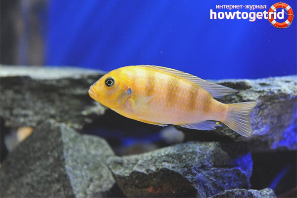 Pseudotrophheus lombardo has the Latin name Pseudotropheus lombardoi. This is a very beautiful aquarium fish, which refers to cichlids. In nature, lives in Lake Malawi. Specialists attribute it to the species of aggressive fish called mbuna.