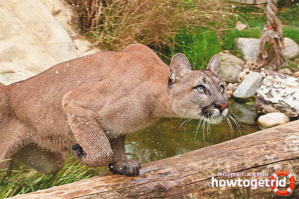 - Cougars by nature are endowed with quick wits, so they often deal even with armadillos, snakes, skunks and porcupines. Big cats try to stay away from water, they do not like to swim. However, if necessary, they can hunt for fish.