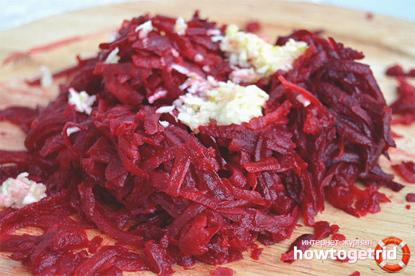 - As for garlic, 1 prong per 1 vegetable. It does not need to be passed through a crush, it is enough to grind the spice very finely, using several knives. Combine the beets with garlic slices, select a dressing.
