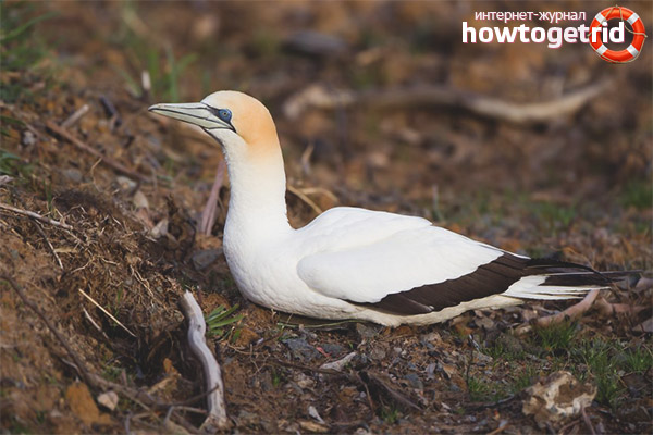 Females and males almost do not differ from each other. They are all with the same white plumage. The neck and head can be not only pure white, but also in some representatives of light yellow. The head and neck in the lateral parts shimmers with a light muted yellow color, and it changes, becoming either darker or lighter, depending on the season. The feathers of the northern gannetwhales are unusual: their structure and a special grease, which appears due to the fact that the bird lubricates them independently, makes the feathers water-repellent.