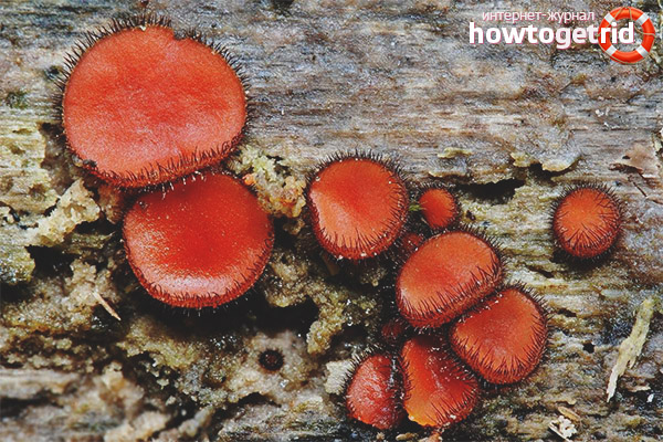 The species of mushrooms presented to attention has rather modest sizes and most often the fruit body of the saucer-shaped scutellinia does not exceed the size of an ordinary coin. At the beginning of its development, the shape of young specimens resembles a ball; with the growth of the fungus, it becomes disc-shaped with a small indentation. The inner part of the scutellinia is bright red, the surface has a paler color - most often yellow-brown.