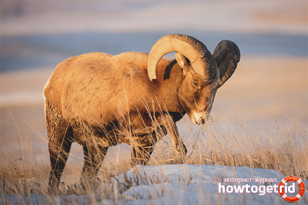 Snow sheep belongs to the family of bovids. An animal is a cloven-hoofed ruminant. His physique is quite large, knocked down, muscular. The structure of the body is vaguely reminiscent of the structure of mountain goats, since they also live in mountainous areas and are forced to move around the territory of high mountain ranges. The body length in males reaches up to 170 cm, in females - up to about 150. The maximum weight of an adult male can reach 150 kg, and this is at a time when there is a lot of food in the meadows.