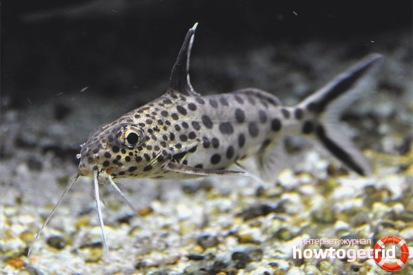 - With regard to external data, catfish streamlined, flattened, elongated along the body. On the lower lip there are 3 pairs of antennae. The color of the fish is spotty, the males are bright and collected, the fin is larger on the back. Females are rounded and thick, not so colorful. Representatives of this family can live in the aquarium for up to 15 years, which is impressive and allows you to attribute them to centenarians.