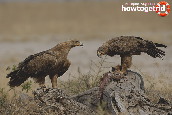 The steppe eagle does not mind eating carrion, especially if there is a sharp drop in the number of hares or ground squirrels. Often you could see how near the carcass of a fallen animal, without internal conflicts, up to 10 predators feed at the same time.