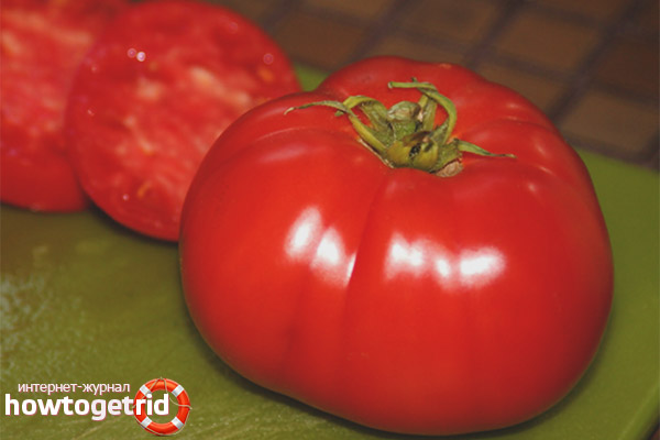 The fruit is flat and rounded with a glossy shiny surface of a reddish-orange color. Inside, a fleshy and homogeneous mass with small chambers for seeds. The fruit is resistant to cracking. Even ripening contributes to an acidic taste. The weight of one ripened vegetable is 0.5-0.6 kg.
