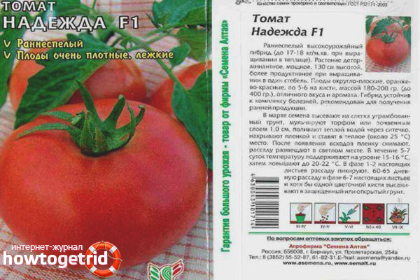 Early ripe hybrid tomato Nadezhda F1 is suitable for growing in heated greenhouses, greenhouses without heating, on an open land plot. The plant is determinant, growth stops at the beginning of fruiting.