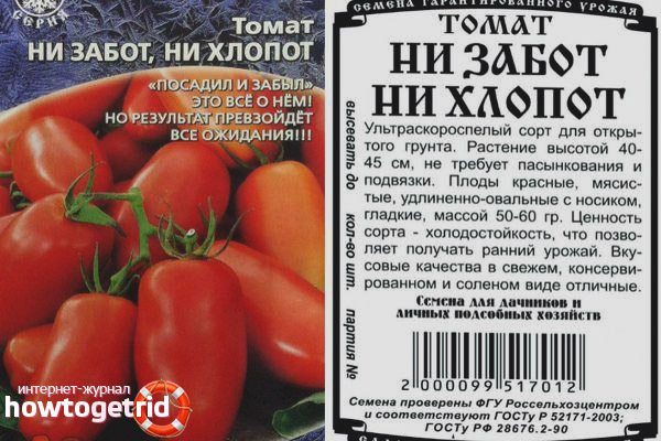 Variety of tomatoes with an interesting name "Neither worries, no hassle" grown in the Urals. Breeders have tried to create a look that meets all the wishes of vegetable growers, the main of which are: a high level of yield, ease of care, resistance to diseases and pests. Each time, the new hybrid obtained has certain advantages over its "ancestors."